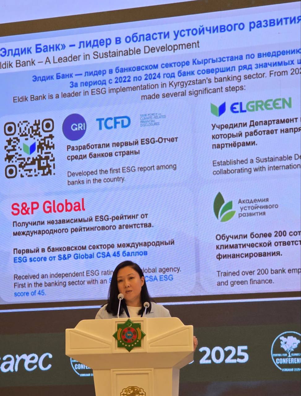 «Элдик Банк» — Борбор Азиядагы жалгыз банк катары конференциянын «Кыргыз Республикасындагы климаттык каржылоо: жергиликтүү банктарды глобалдык өнөктөштөргө айлантуу» сессиясында баяндама жасады. Банктын ESG боюнча туруктуу өнүгүү департаментинин жетекчиси Айджан Кариева банк тарабынан жашыл каржылоо тармагында жүргүзүлүп жаткан иштер, климаттык багыттагы продуктыларды ишке киргизүү, эл аралык институттар менен өнөктөштүк жана көмүр кычкыл газынын изин азайтуу стратегиялары тууралуу айтып берди.